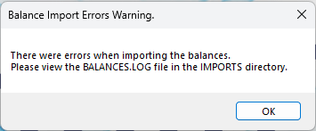 Should any errors occur during this process a warning message advises you to view the text file called BALANCES.LOG in the IMPORTS folder to check for details of the errors – see below. To troubleshoot any errors, you can use the Troubleshooting ASCII CSV File Data Errors section in the Appendices.