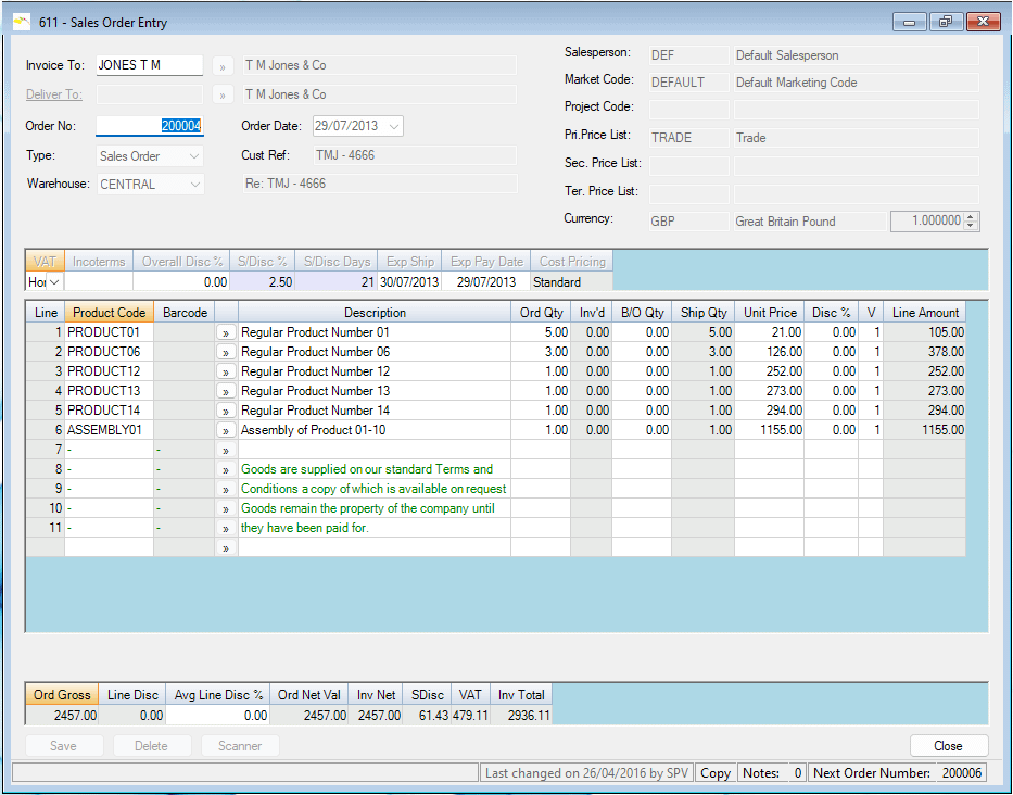 Similarly to Products, a virtually unlimited number of Notes can be attached to Orders. The first note can also be displayed on Documentation produced by programs 621 – 625. Notes can be used for any purpose – calculations, reminders or even simple order updates (where the customer calls to change their mind about the quantity of an item they wish to buy).