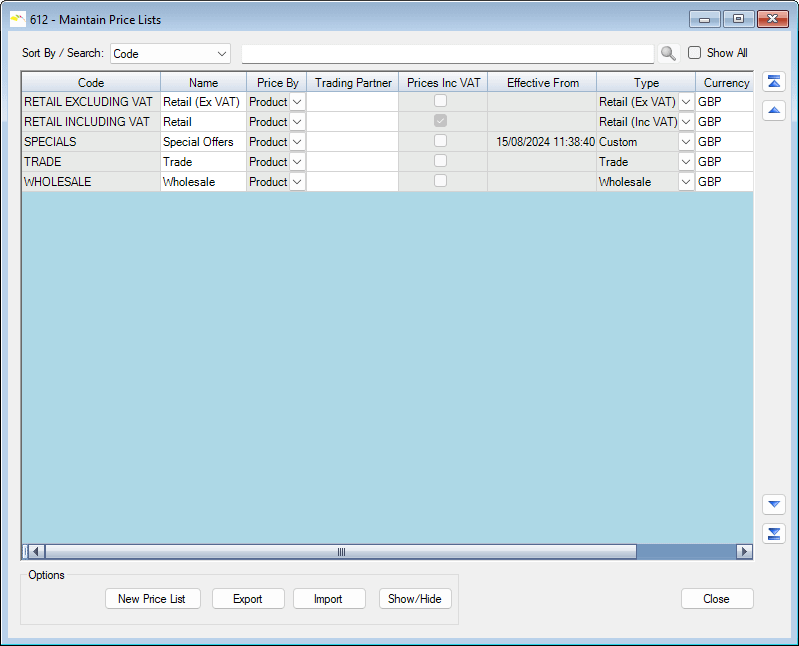 Initially your Price Lists are displayed in a grid for easy access and where you can rapidly change important information in some of the columns:
