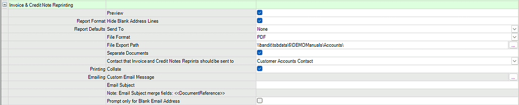 It has it’s own set of settings in program 0.1.1 which allow you to set the default values of many of the Report Options (for example – always set the default Send To value to PDF, saving a copy of the document produced to a specific folder on your server computer rather than the default TASBooks data folder).