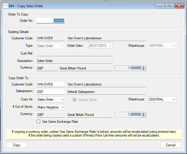 | This function lets you copy an existing Sales Order to a new order. Not only can the new order be of a different type to the original order, but, unlike TAS, it can be for a different customer too. |