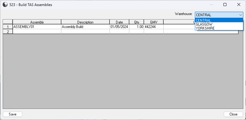 This function lets you enter TASBooks Assemblies to be built (rather than BoM Assembly Builds, which are processed through Works Orders via the Manufacture feature), together with their dates and quantities. If you select a warehouse which has not previously held any stock of a particular assembly and/or part, the product record(s) for the warehouse concerned are created automatically based on the defaults you set up, e.g. NL Department.