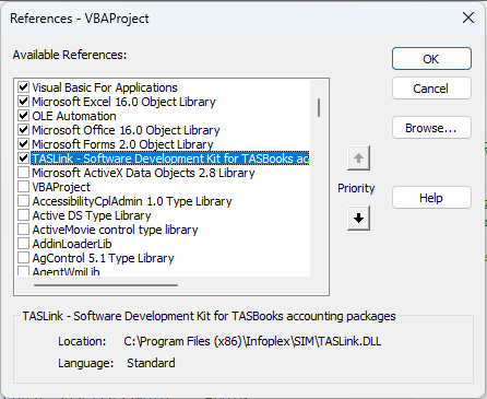 (If you have used early binding, as above, you could alternatively write: Set oSDK = New TASLink.TASBooksAccountingCompany)