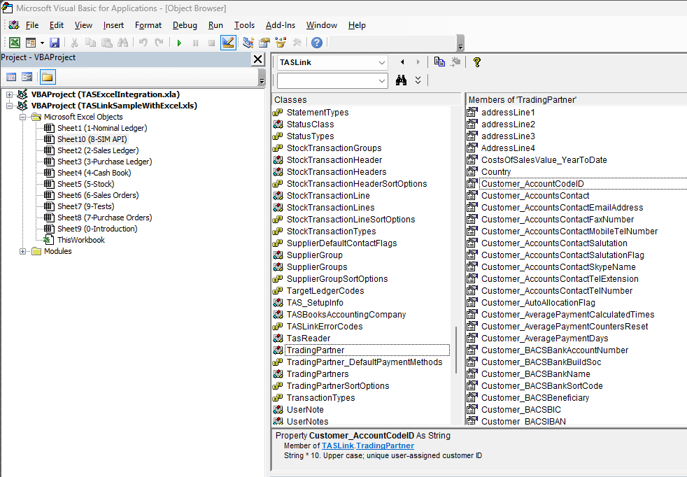 You can find plenty of sample code in the Setup and Login for the TASLink Object section and subsequent Working with sections below, as well as in the sample spreadsheet TASLinkSampleWithExcel.xls, which is installed in your local SIM home documentation folder (by default C:\Program Files (x86)\Infoplex\SIM\Docs or for 64-bit computers C:\Program Files (x86)\Infoplex\SIM\Docs). To use the spreadsheet you must have completed the full Installation and Setup as described in the Quick Start section above. The spreadsheet contains many worksheets each with several working examples, which relate to the standard TAS Demonstration Company (tutorial data) and which illustrate a small number of the huge range of possibilities available.